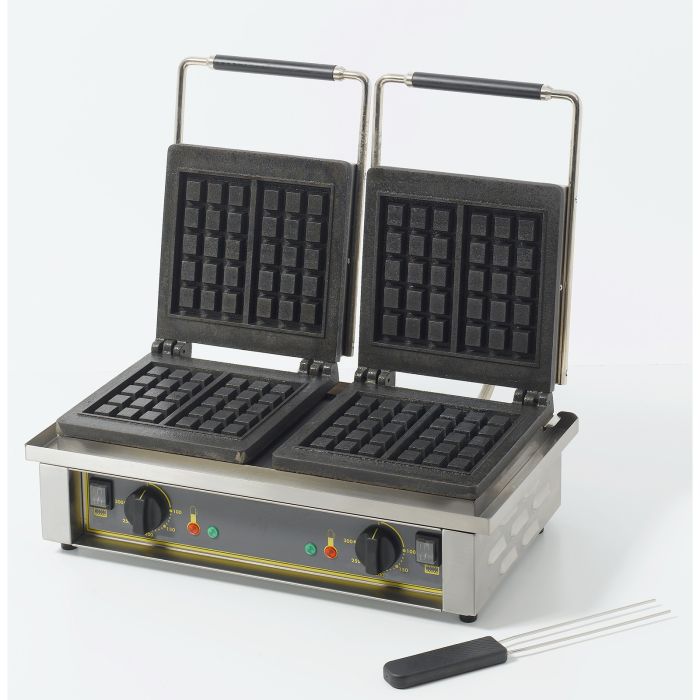 The GED10 Waffle Iron is specifically for “Brussels” pattern waffles. The cast iron plate features four 3 x 5 squares for speed. Using either a specific batter or pre-formed waffles the GED10 will produce great tasting waffles in just a couple of minutes. The elements are seated beneath both cooking plates, giving rapid and even heat distribution across the whole cooking area. The GED10 has a 4 sided drip tray making it suitable for use with fresh batter mix or frozen waffle dough.